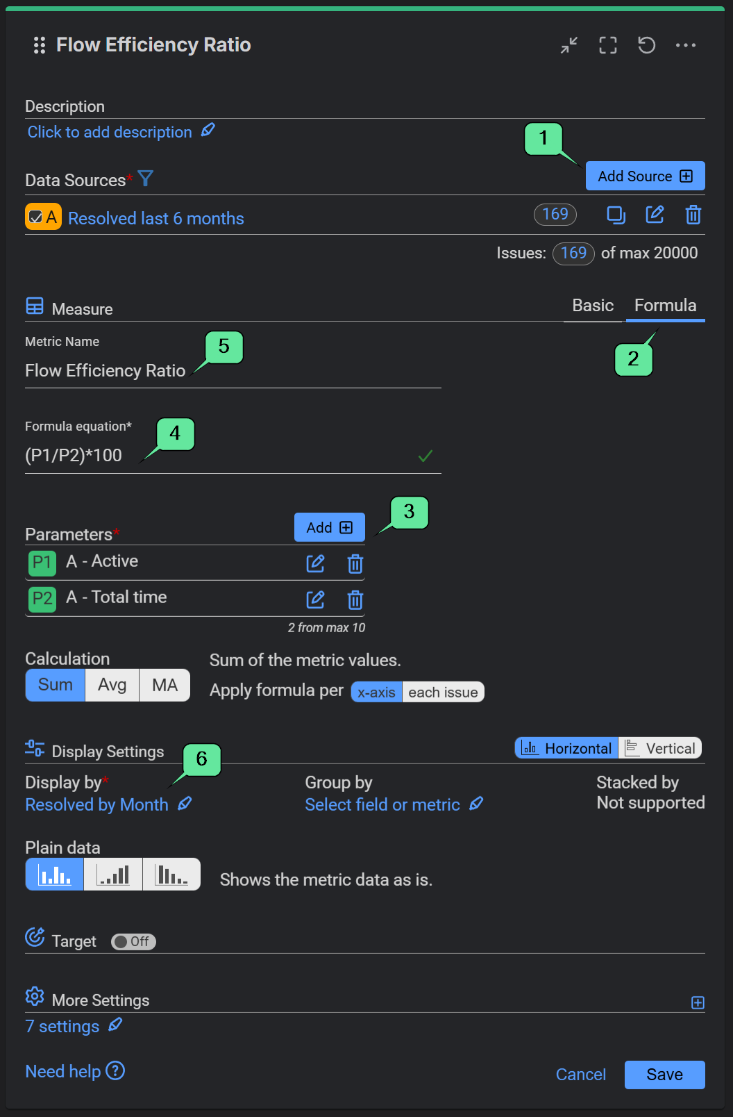 In our sample configuration, we define Active Time using the Time in Status metric, selecting statuses mapped to the ‘In Progress’ category (In Progress, In Review, In QA). For the Total Time parameter, we use Lead Time and the Time Between metric, measuring the total duration from ‘Created’ to ‘Resolved’, to ensure the ratio accurately captures the end-to-end lifecycle of a work item.