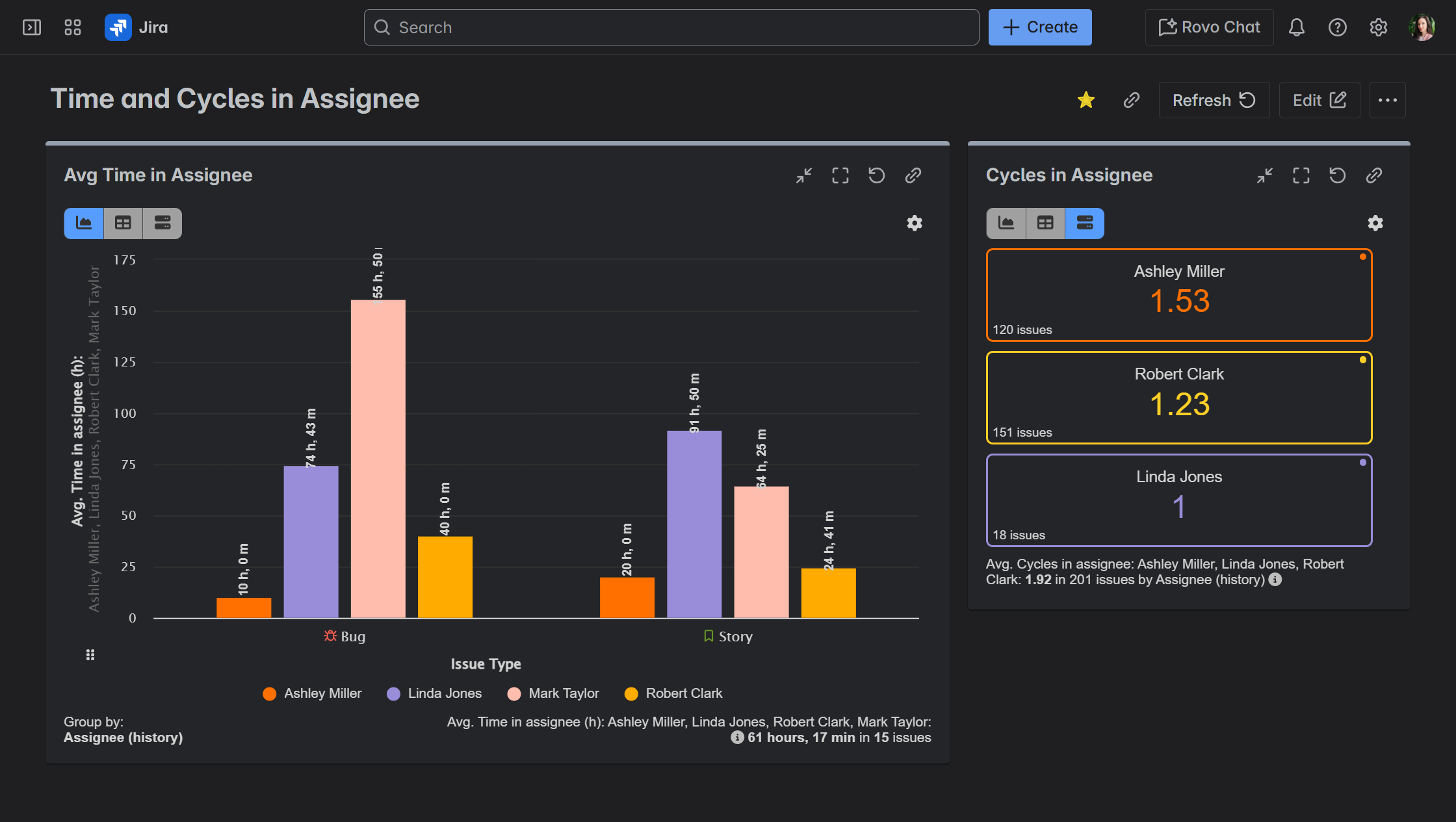 This chart highlights the average time an issue stays assigned to each team member, giving insight into how long each individual is taking to complete their tasks. If certain team members consistently have higher average times, it could indicate overburdening or process inefficiencies in their workflow. On the flip side, if issues are moving quickly through certain assignees, it could suggest effective personal workflows or areas where best practices can be shared across the team.