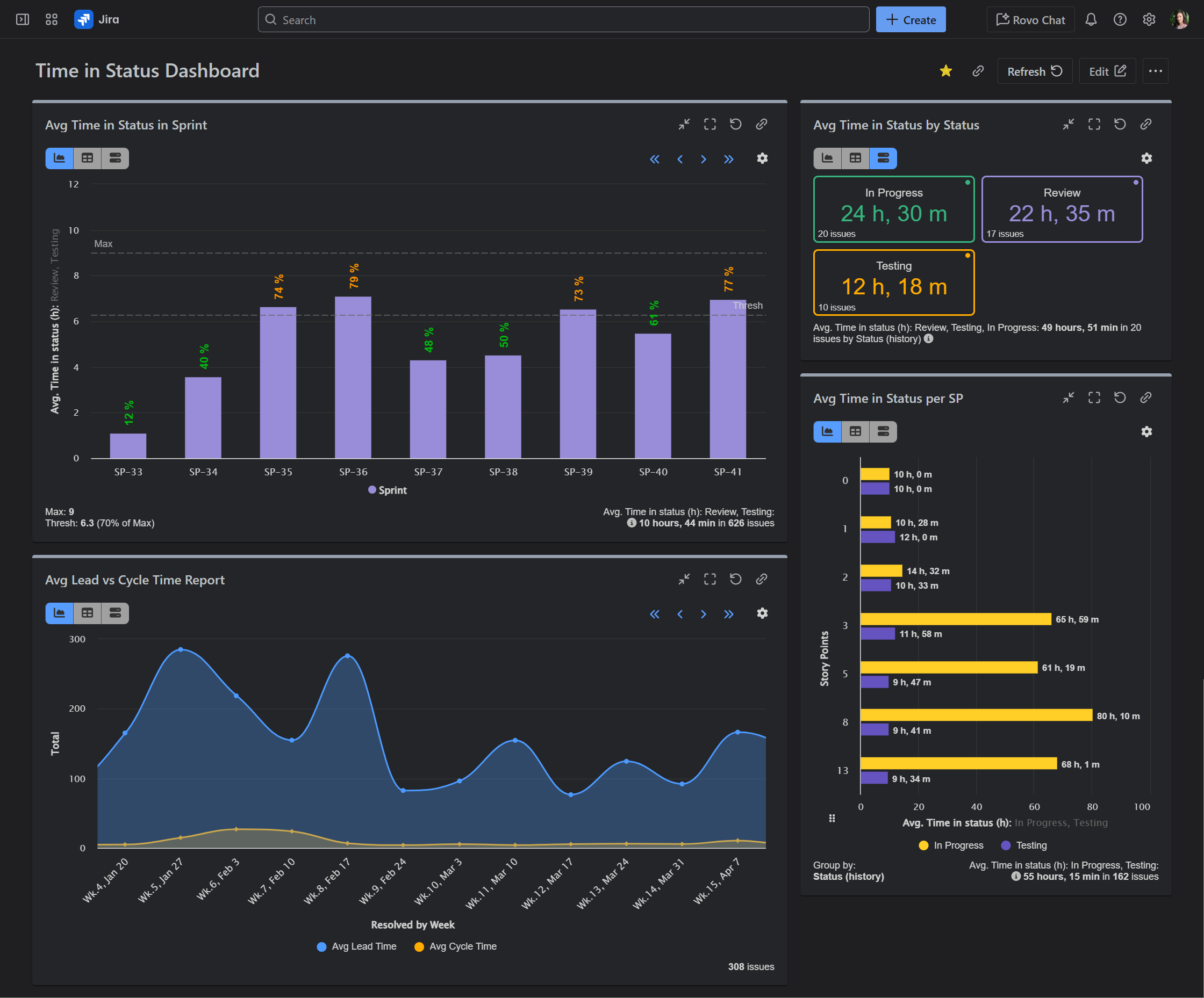 On this sample Jira dashboard below, created using the Performance Objectives app’s gadgets, we’ve configured four key Time in Status reports, combined with valuable Sprint-related data and various visualizations to enhance comprehension. Additionally, we’ve included an insightful Lead Time vs. Cycle Time report, along with a use case that highlights the maximum time in status duration.