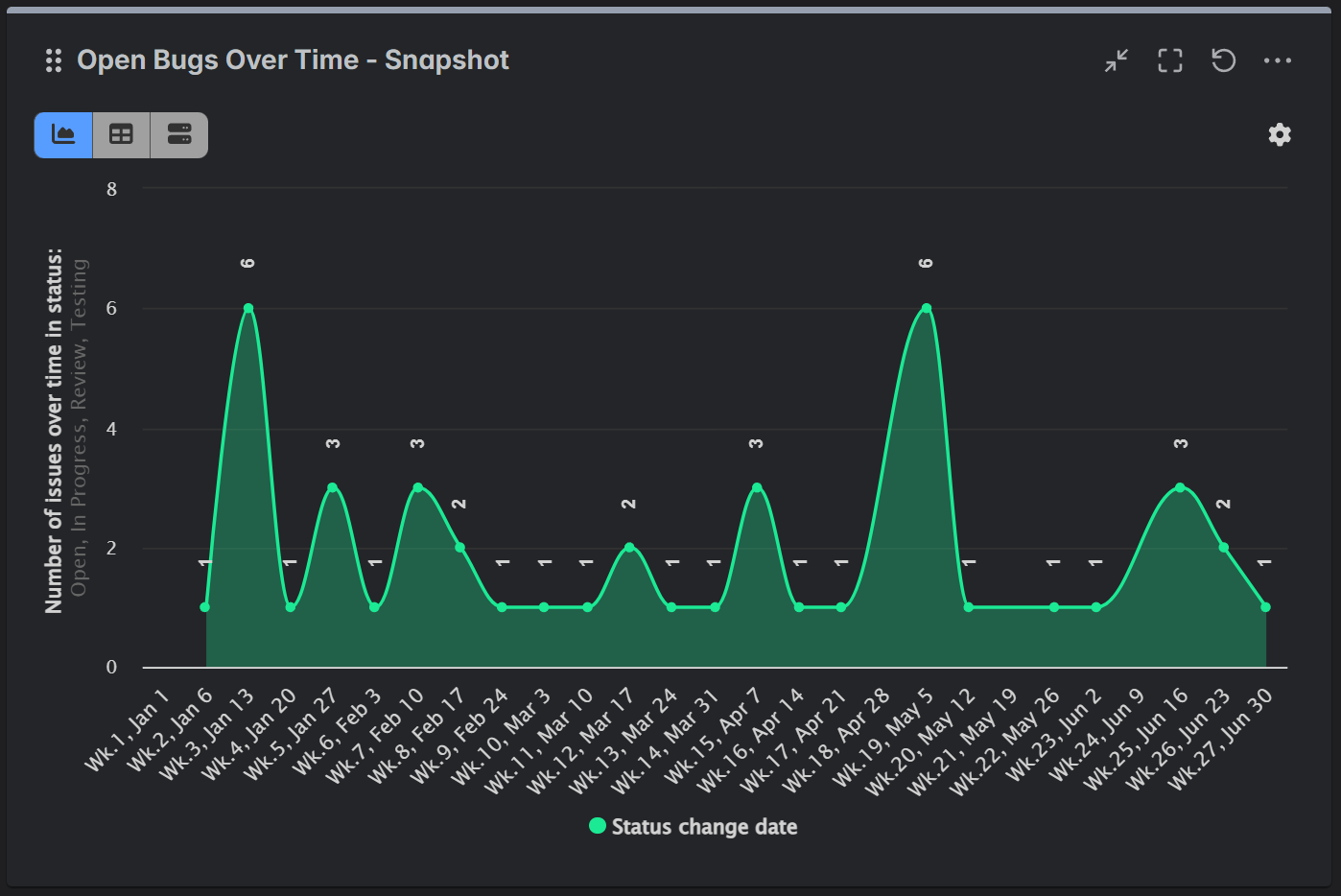 - Full time: This mode measures the total volume of issues that passed through a status. It counts any issue that was in the selected status(es) at any point during the interval, regardless of its end-of-period status. For example, an issue created and resolved on the same day will be counted as having been in an ‘Open’ status for that day’s interval. This is useful for understanding total workload, activity, or churn within a period.